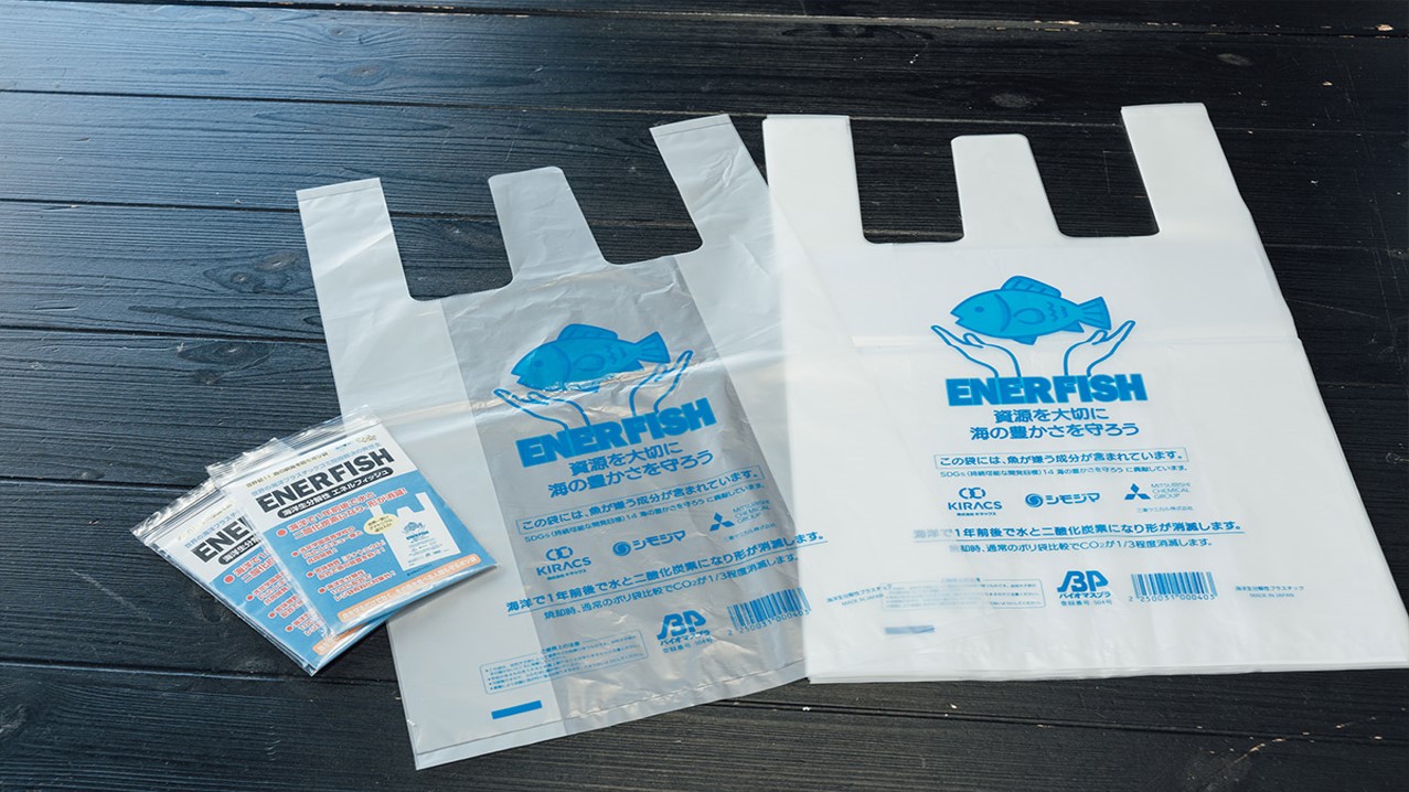 今回展示された“ENERFISH”とは、レジ袋に苦味成分デナトニウムを配合し、魚がレジ袋を誤食することを防ぐ商品です。