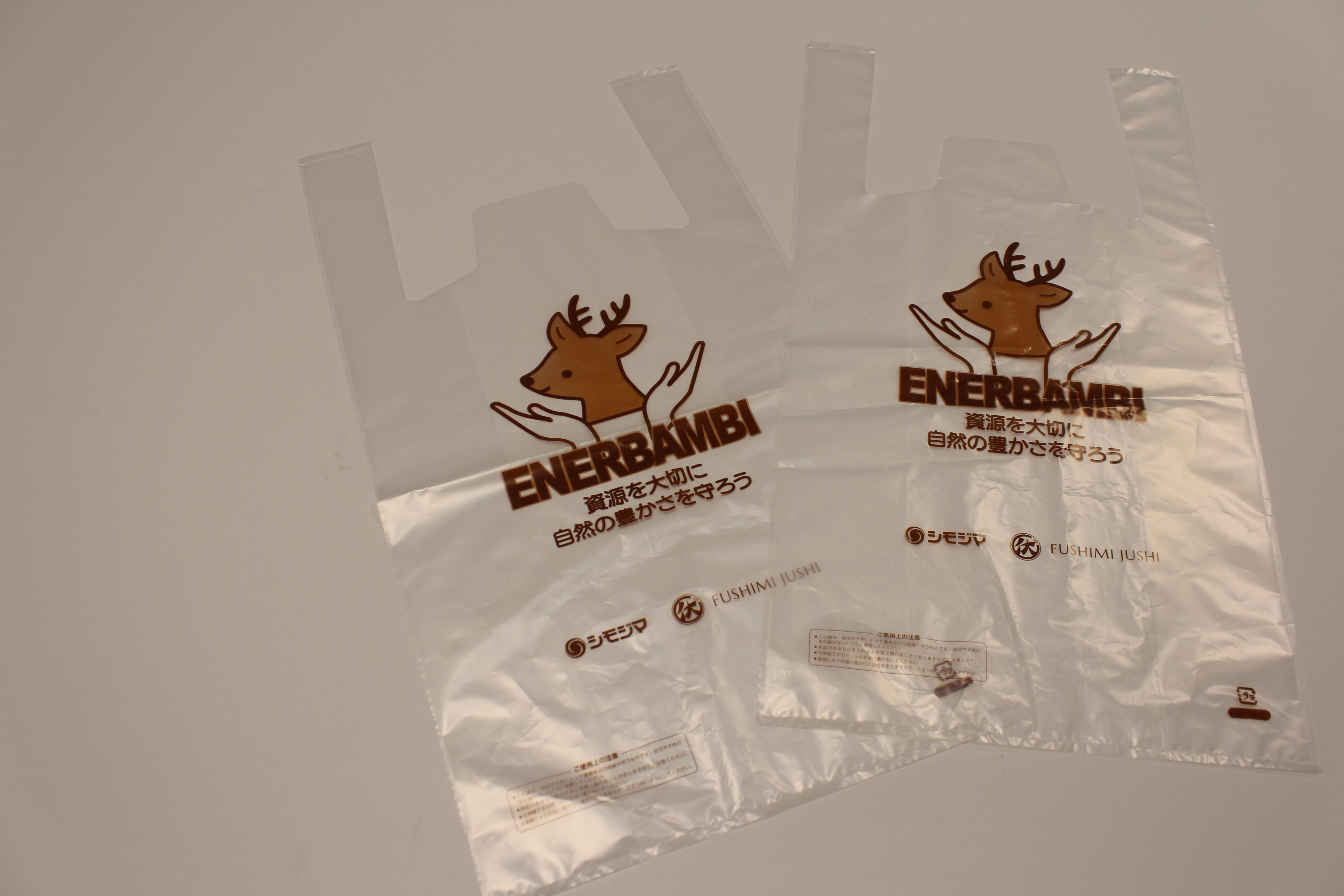 ENERBAMBIは、伏見樹脂株式会社と共同開発した、鹿の胃液で数週間のうちに分解がみられる生分解性レジ袋です。