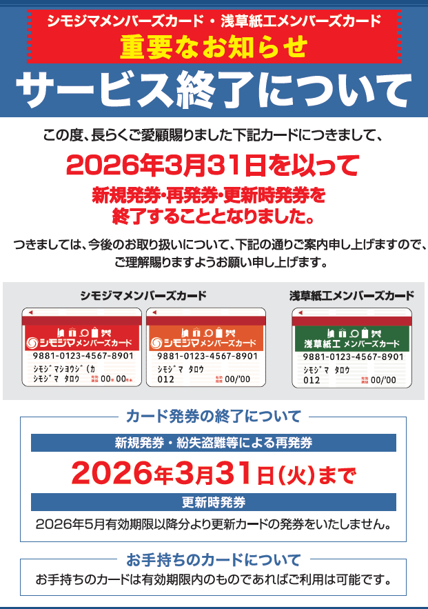 このたびシモジマメンバーズカードおよび浅草紙工メンバーズカードは、