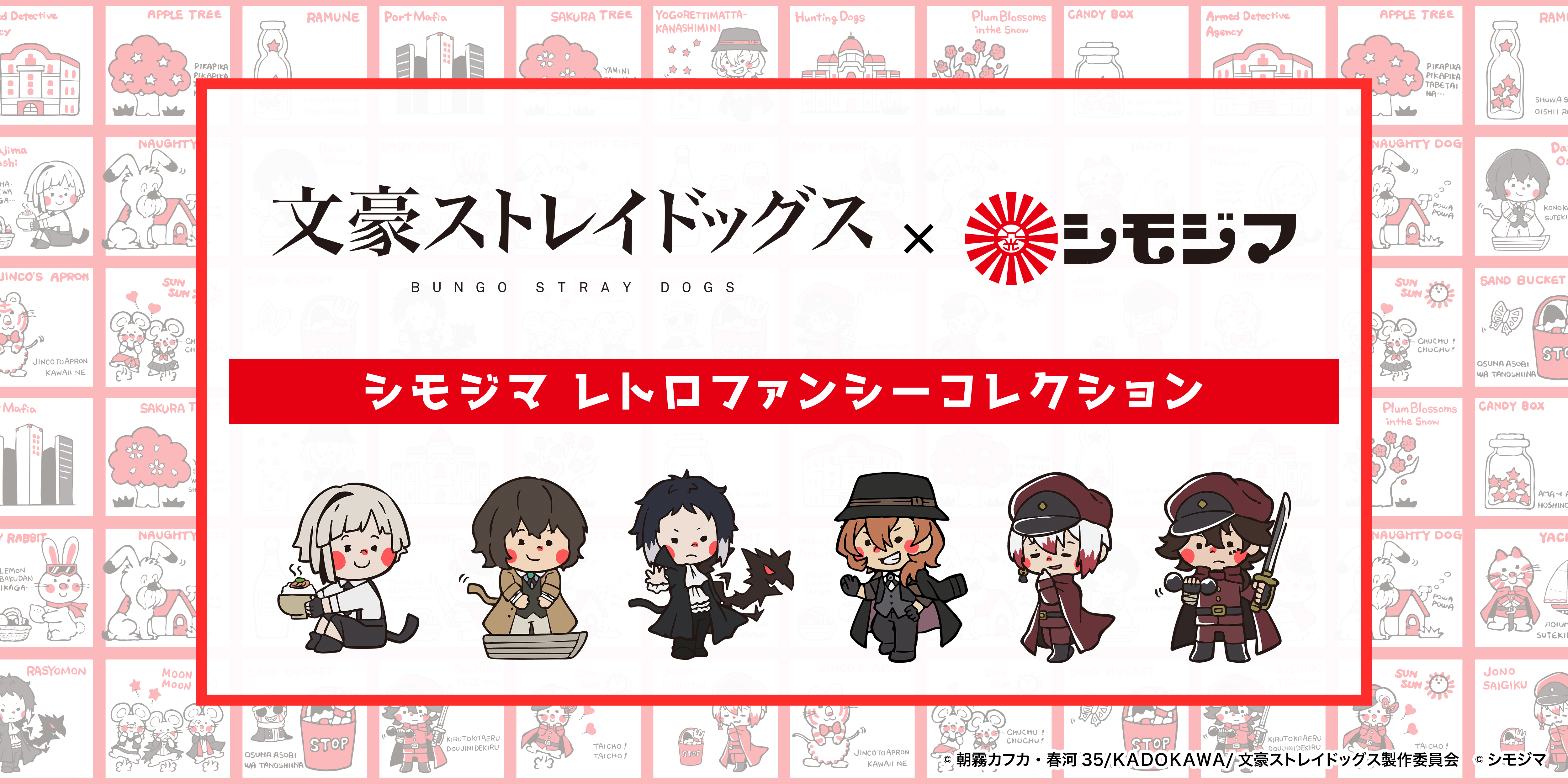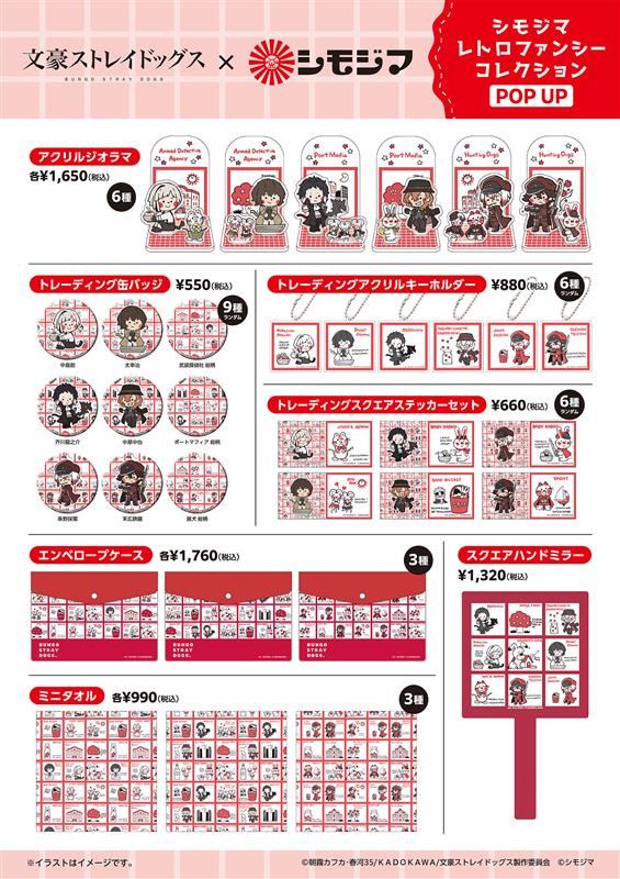 本POP UPでは、アニメ「文豪ストレイドッグス」(©朝霧カフカ・春河35/KADOKAWA/文豪ストレイドッグス製作委員会)、映画「ヒプノシスマイク -Division Rap Battle-」(©ヒプノシスマイク -Division Rap Battle- Movie)とシモジマのオリジナル包装紙「ストップペイル」のコラボレーショングッズを販売いたします。